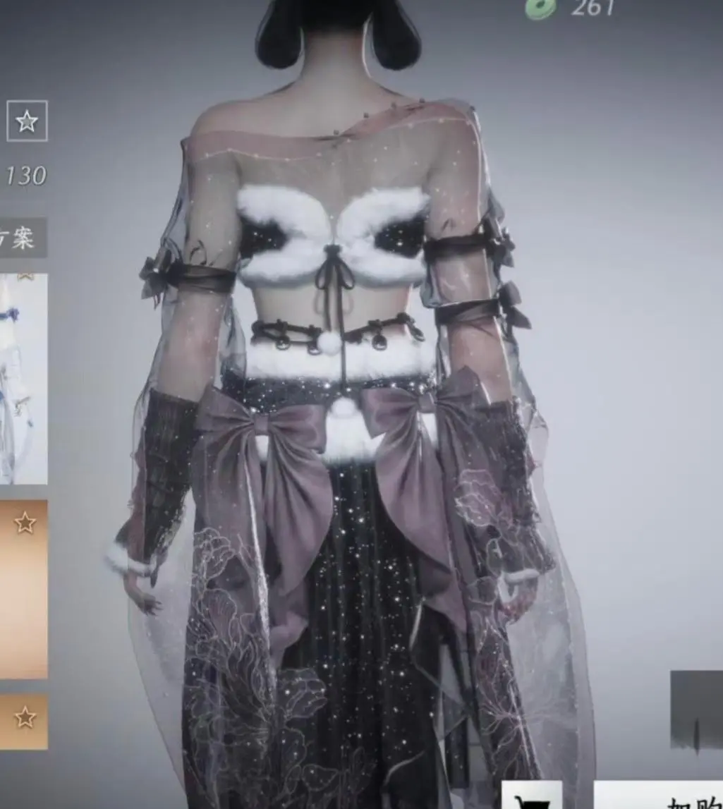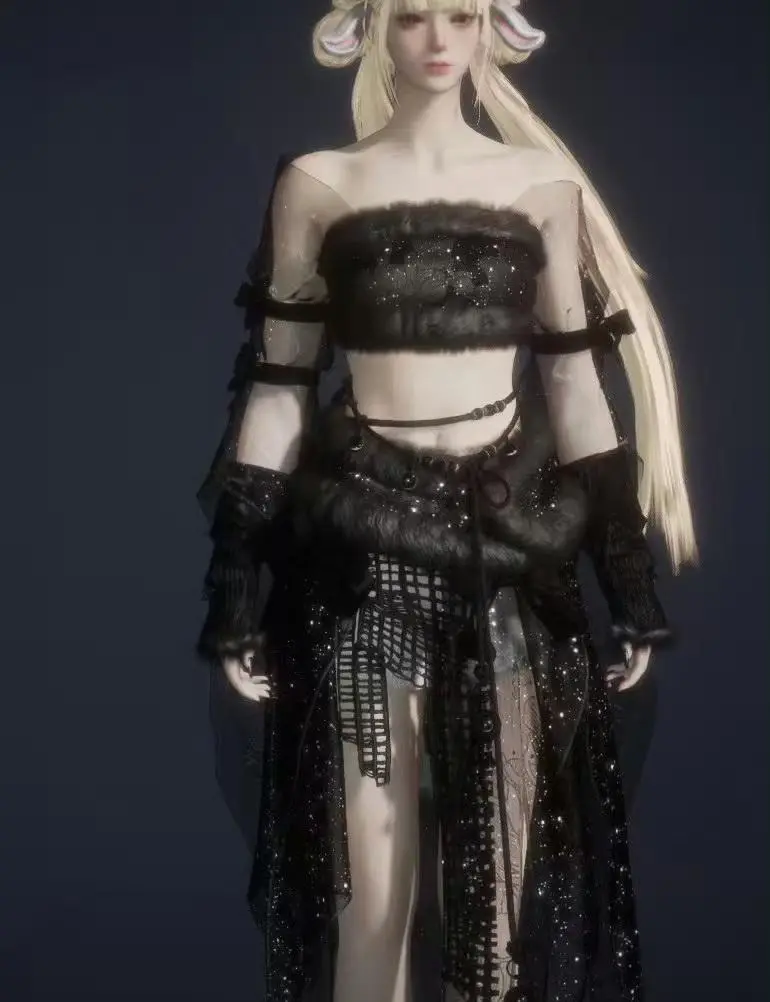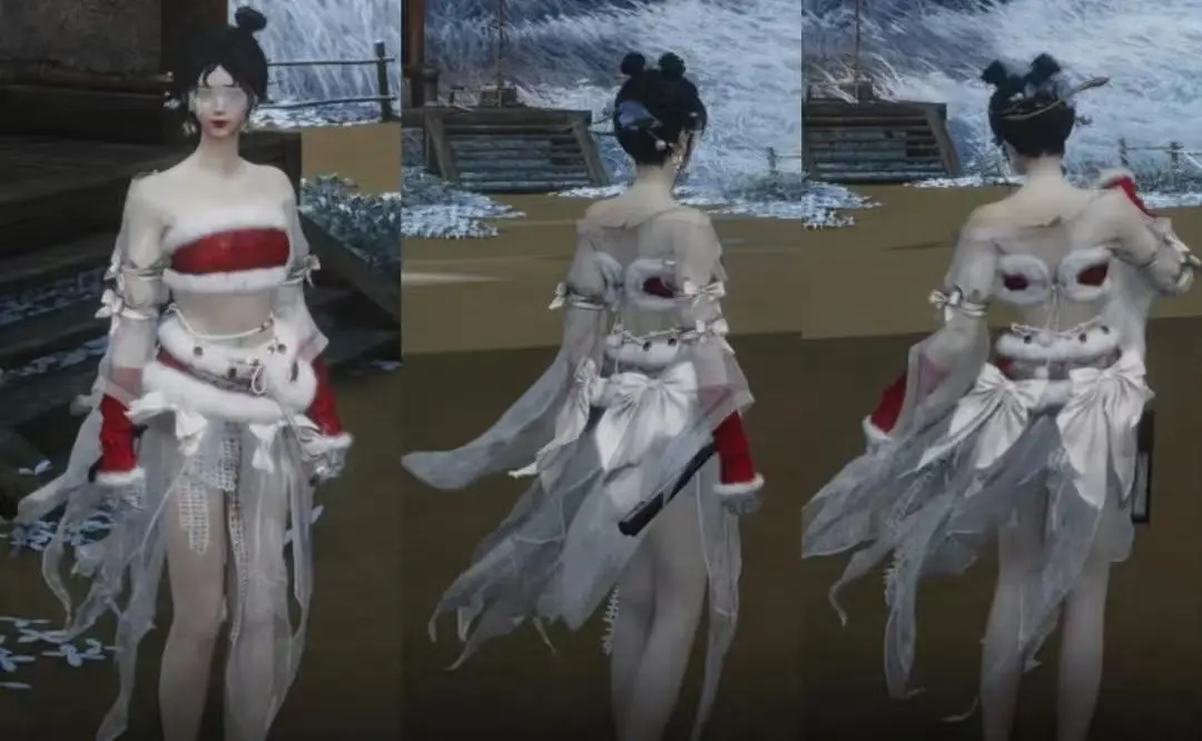 这套服装的背部为可一拉即开的蝴蝶结系带抹胸,下摆则为口呈撕裂状的贴身打底短裤。当玩家进行染色后,部分颜色组合使这套服装在视觉上更接近于情趣内衣。角色在跑动时,甚至还出现了类似“没穿裤子”的穿模视觉效果。