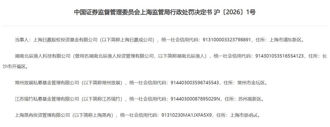 在上海证监局披露的另一则行政处罚决定书中则显示出了,与瑞丰达关联的5家私募机构,他们分别为上海日赢股权投资基金有限公司、湖南北辰渔人科技有限公司、常州放展私募基金管理有限公司、江苏瑞竹私募基金管理有限公司、上海蒸冉投资管理有限公司。