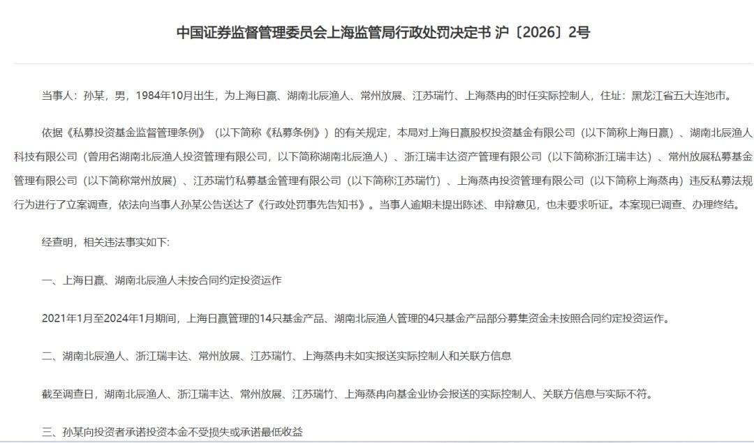 上海证监局认为,孙伟为上海日赢、湖南北辰渔人、浙江瑞丰达、常州放展、江苏瑞竹、上海蒸冉的时任实际控制人,全面负责公司经营管理。孙伟是上海日赢、湖南北辰渔人未按合同约定投资运作行为的直接负责的主管人员,是湖南北辰渔人、浙江瑞丰达、常州放展、江苏瑞竹、上海蒸冉未如实报送实际控制人和关联方行为的直接负责的主管人员。因此,该局对孙某责令改正,给予警告,并处一千一百九十万元罚款。