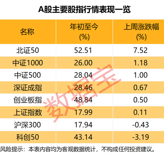 10月27日至31日,A股市场冲高回落,市场成交规模维持在2.1万亿元上方。指数方面,上证指数一周小幅上涨0.11%,最新报3954.79点;深证成指上涨0.67%,创业板指上涨0.5%。北证指数上周大涨7.52%,为周涨幅最高的A股主要指数。