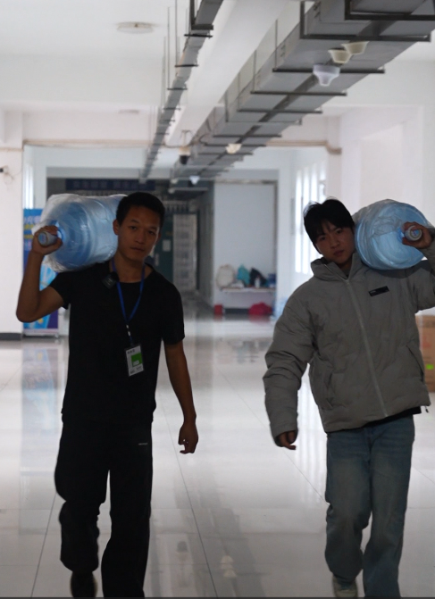△姚顺涛正在和同学送水(白色衣服为姚顺涛)。图/王贯宇摄