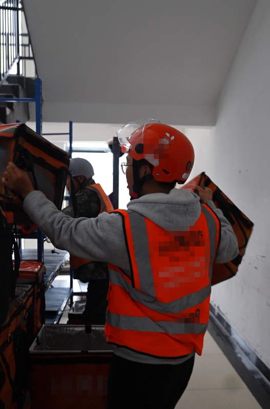 送餐点现场,记者看到,有学生将餐食放到配送箱中骑车离开,姚同学介绍,每栋楼都有他们的送水点,有同学佩戴工牌分包不同楼:送水、送餐食。